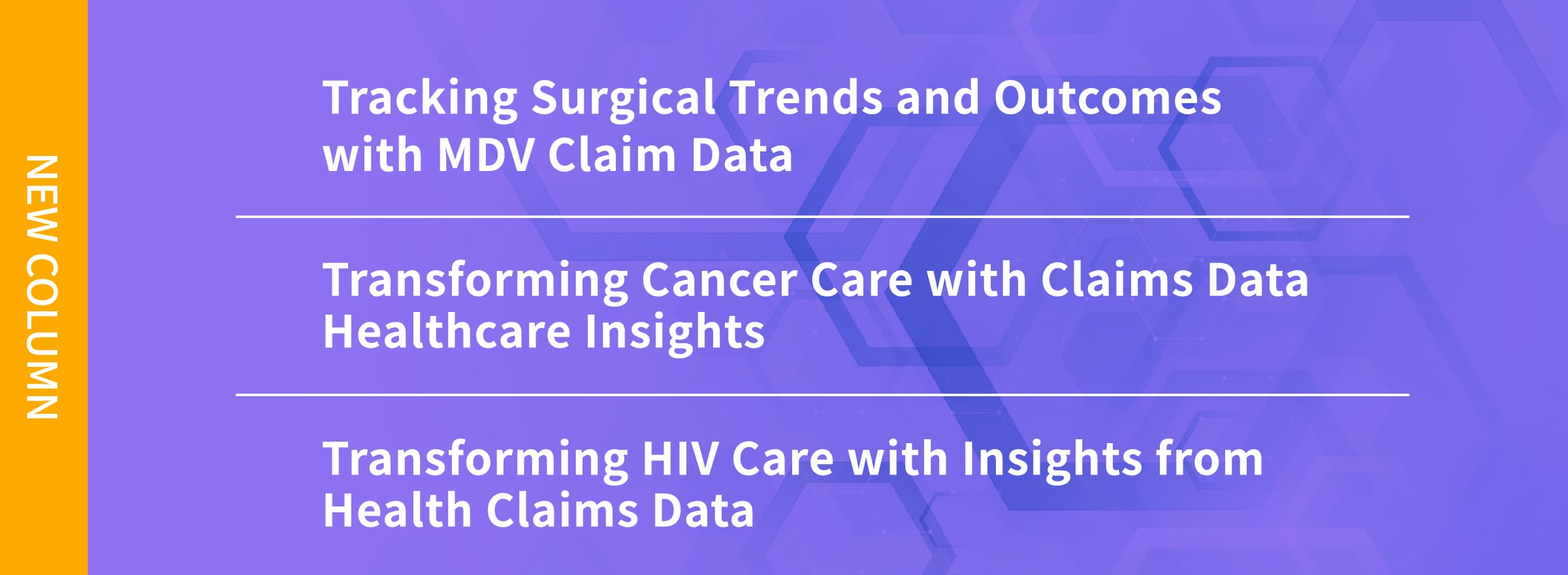 - UPDATENovember 17, 2025New Column < #61 Tracking Surgical Trends and Outcomes with MDV Claim Data, #62 Transforming Cancer Care with Claims Data Healthcare Insights, #63 Transforming HIV Care with Insights from Health Claims Data > has been added