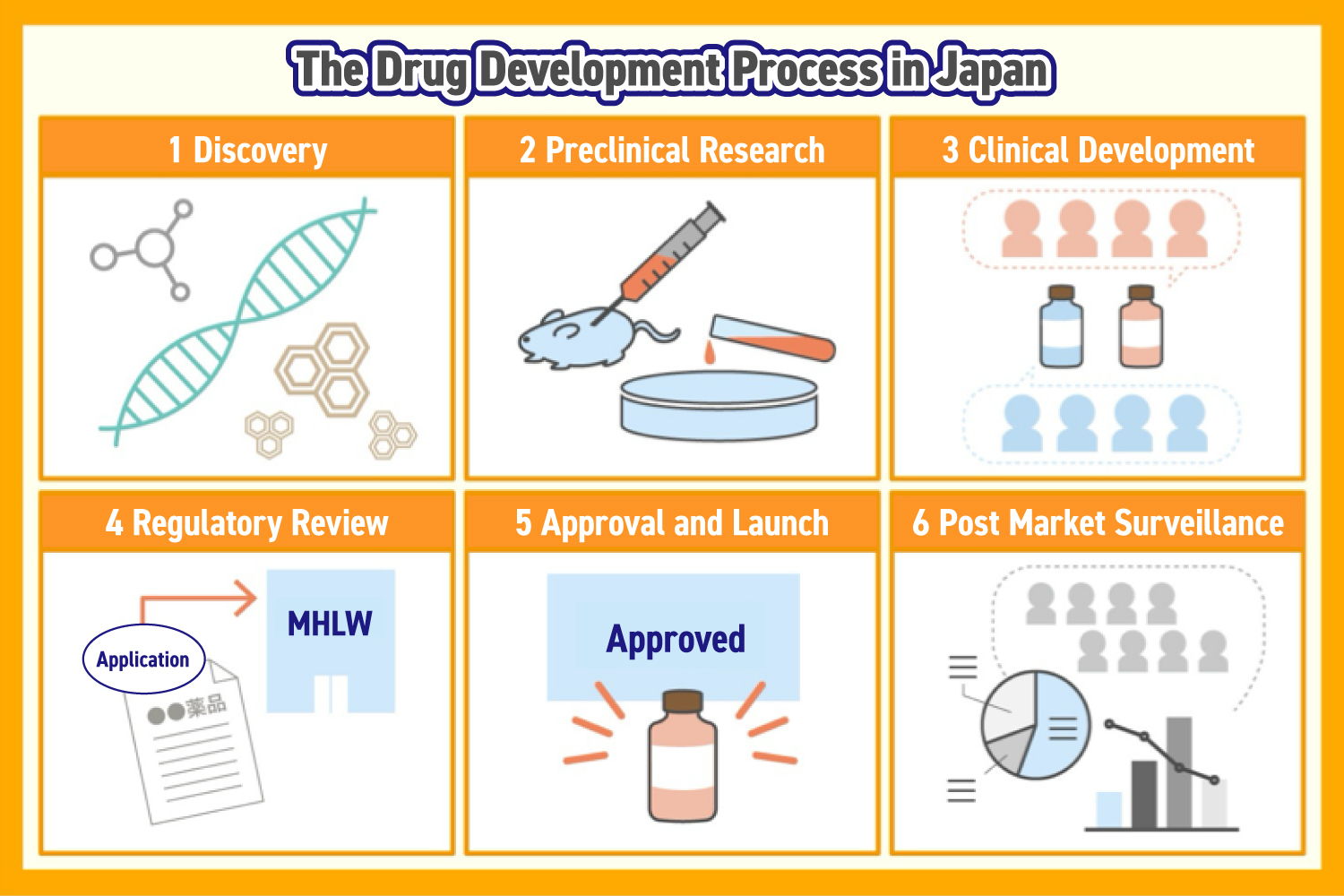 In simple terms, drug development is the process of creating new medicines. Before a medicine can be used in hospitals or clinics, it must go through several stages: discovering the active compound, conducting basic research and clinical trials, and obtaining approval from the Japanese Ministry of Health, Labour and Welfare (MHLW). The drug discovery process typically takes 10 to 18 years and can cost around 20 billion yen, requiring substantial time and investment.