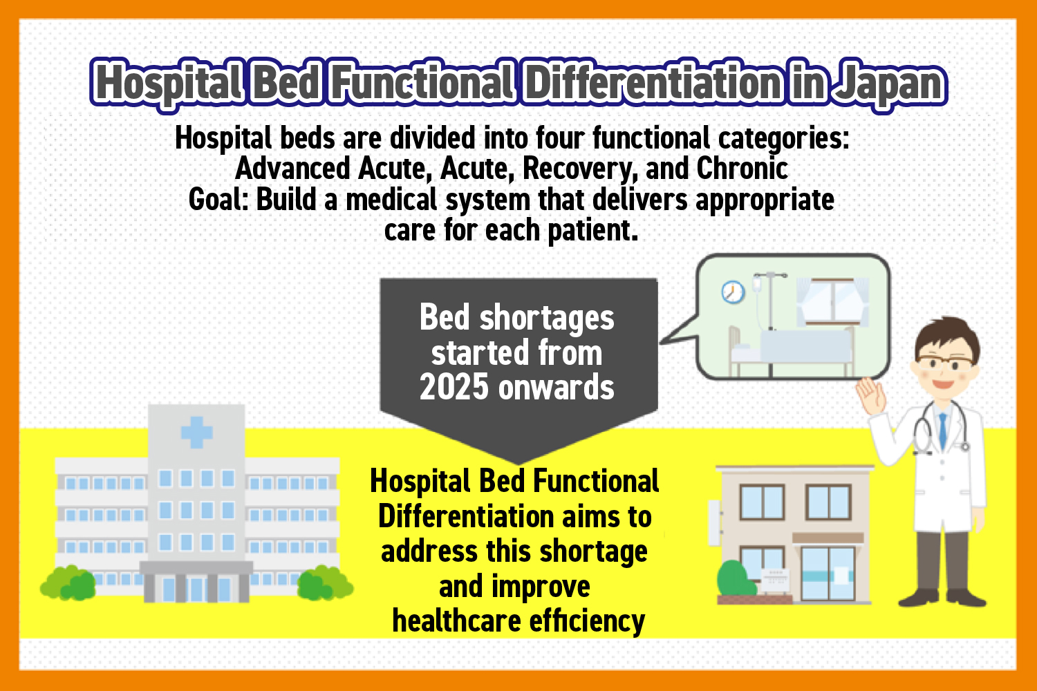 Hospital bed functional differentiation is a healthcare initiative aimed at reorganizing hospital beds into four functional categories: advanced acute care, acute care, recovery care and chronic care. This reform represents a major modernization of the Japanese hospital system. The goal is to improve the efficiency of medical services and enable patients to choose medical care that better suits their individual needs. The government plans to complete this reorganization by 2025 to address key healthcare challenges.