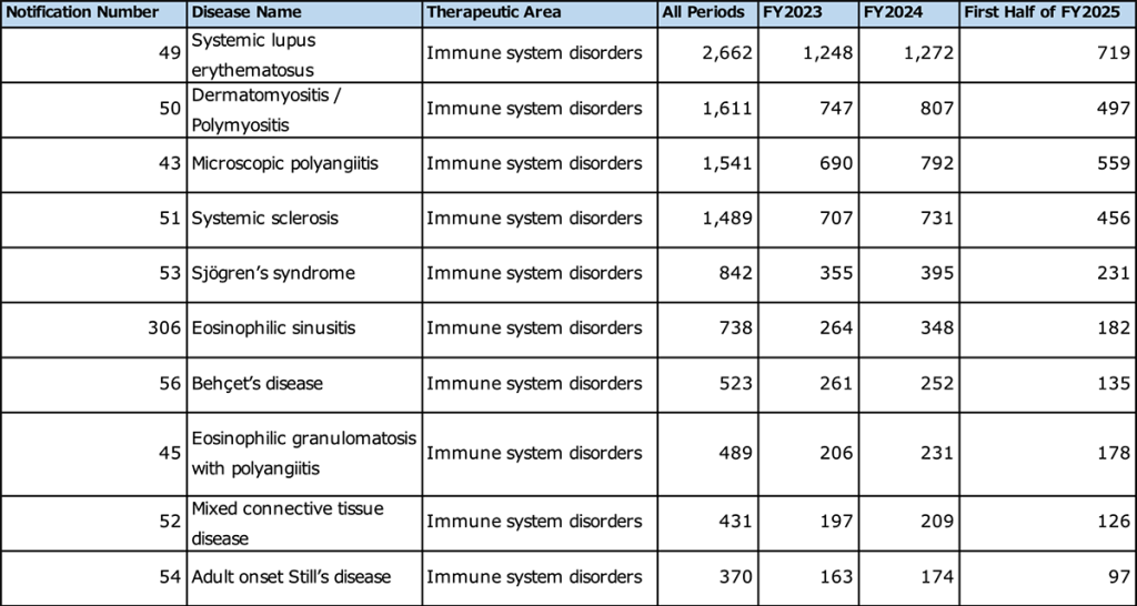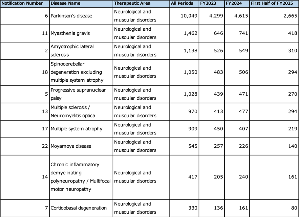 Among diseases targeted by orphan drugs approved over the past two fiscal years, amyotrophic lateral sclerosis (1,138 patients), immune thrombocytopenia (1,250 patients), and myasthenia gravis (1,462 patients) stand out as having relatively large numbers of hospitalized patients even within the rare disease category. In contrast, diseases such as distal myopathy (7 patients) and Lennox–Gastaut syndrome (20 patients) had extremely small numbers of hospitalized patients.