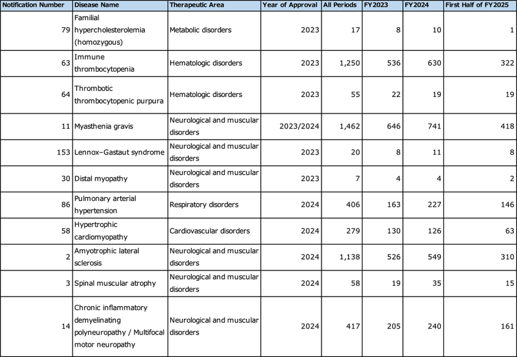• trends in the number of hospitalized patients for diseases targeted by orphan drugs approved in fiscal years 2023–2024 (Table 4).