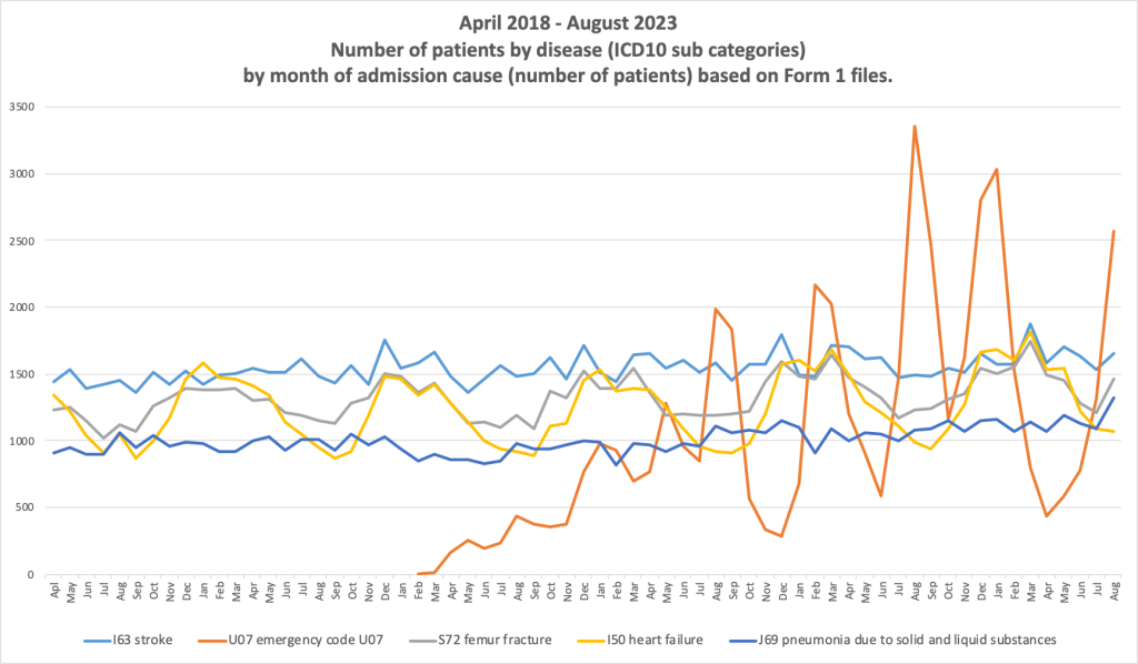 Since 2020, the number of hospitalized patients for U07 (Emergency Code U07 = COVID-19 related) has been sharply increasing, but no corresponding decrease has been observed in the hospitalization numbers for other top conditions such as cerebral infarction, femoral neck fracture, and heart failure.