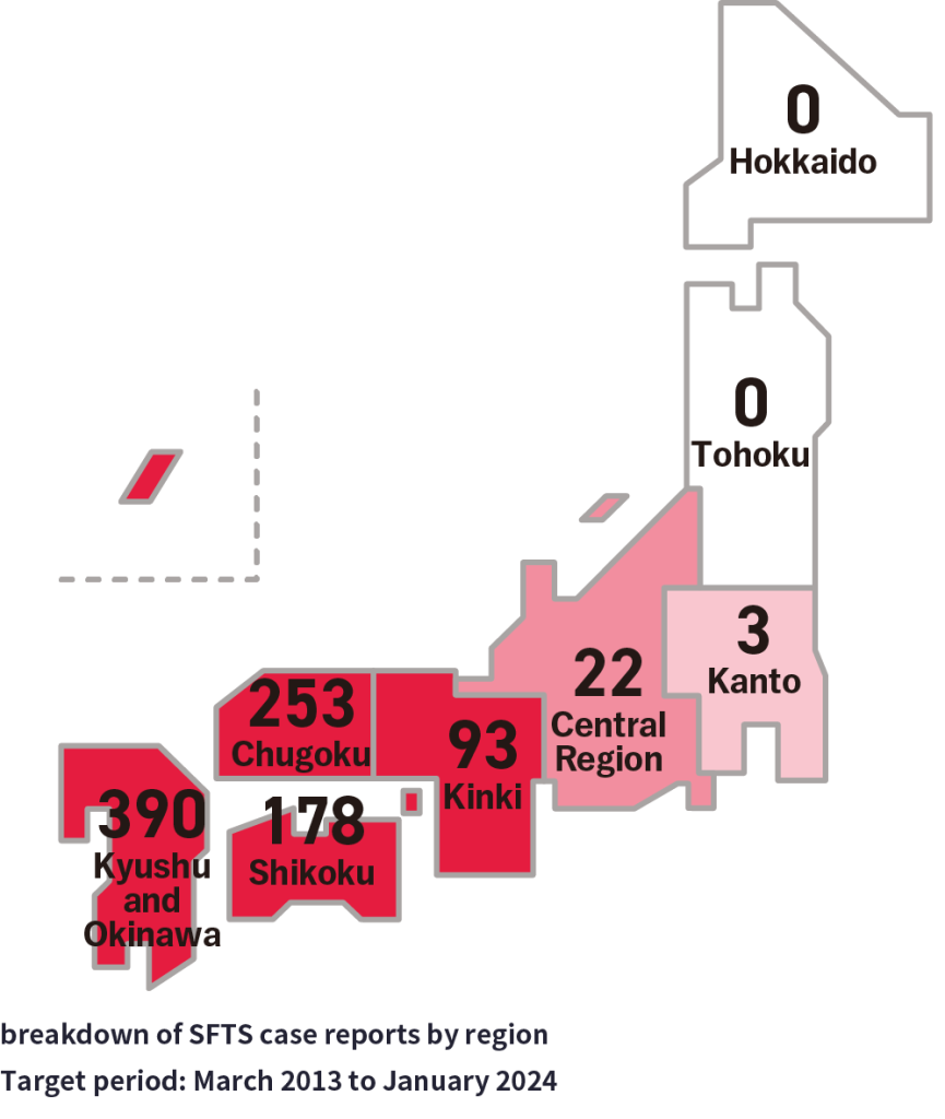 National Institute of Infectious Diseases ” Regions where SFTS cases were reported (n=939, as of January 31, 2024)”