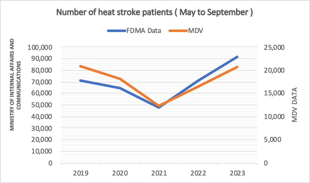 we compared the Ministry of Internal Affairs and Communications Fire and Disaster Management Agency’s “Total number of emergency transports due to heat stroke from May to September 2019 to 2023” with the actual number of heat stroke patients in the MDV data (8844801: Number of heat stroke patients ).