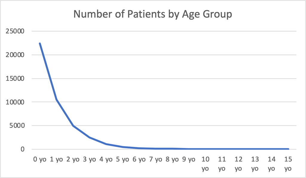 Among infants under one year of age, the number of cases was approximately 22,000, the highest of all age groups. This number was found to halve by the time children reached one year of age. Beyond the age of six, the number of cases remained very low, as seen in the data.