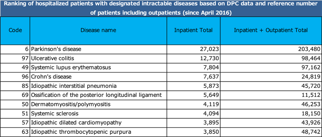 - Ministry of Health, Labour, and Welfare, “Designated Intractable Diseases and Clinical Research Patient Lists” (https://www.mhlw.go.jp/stf/newpage_36011.html).