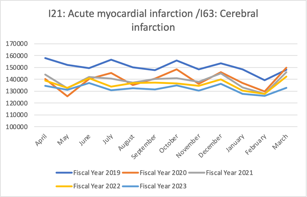 First, we investigated the monthly trends in the number of patients with acute myocardial infarction and cerebral infarction.