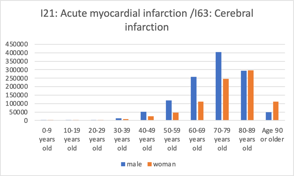 The incidence of acute myocardial infarction and cerebral infarction increases with age, increasing significantly especially after the age of 50, and then rapidly increasing in those over the age of 70. Additionally, while the incidence rate is higher in men than in women overall, the proportion of women is relatively higher in those over the age of 90, which may be influenced by the longer life expectancy of women.