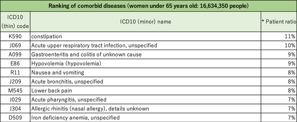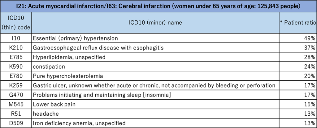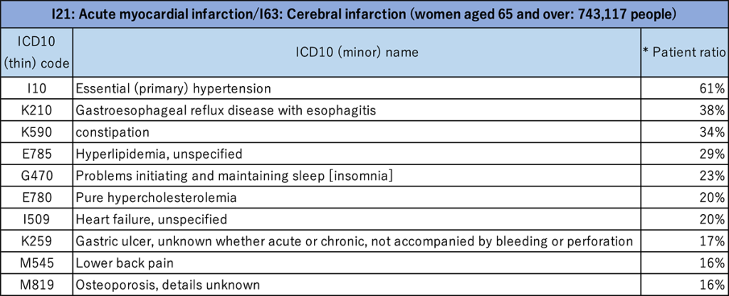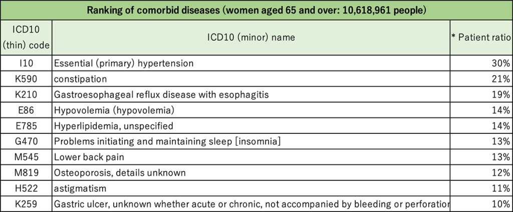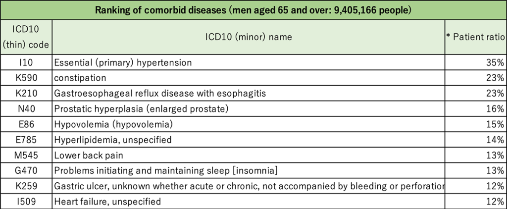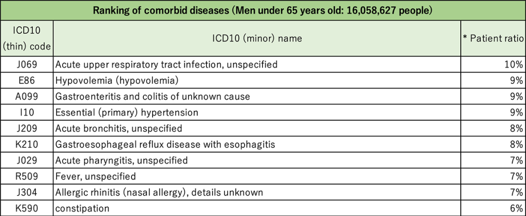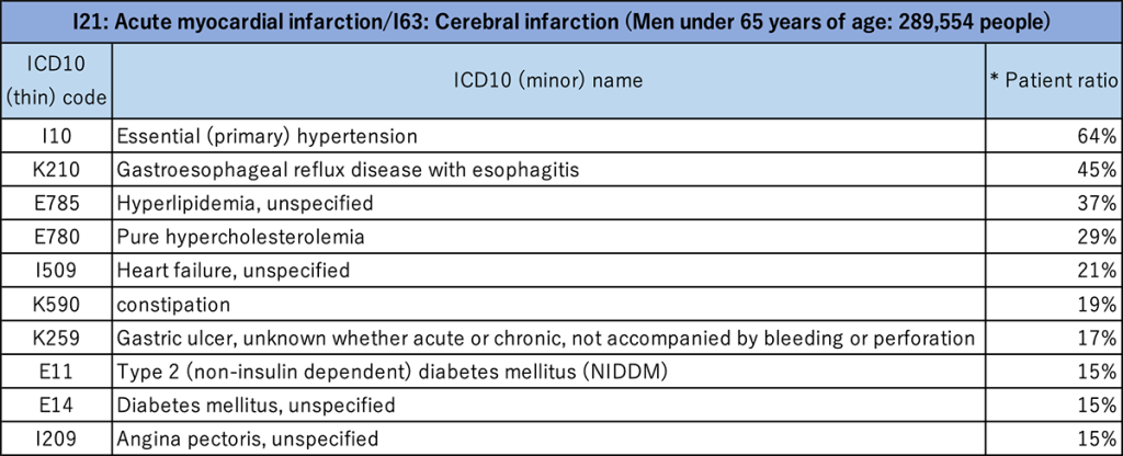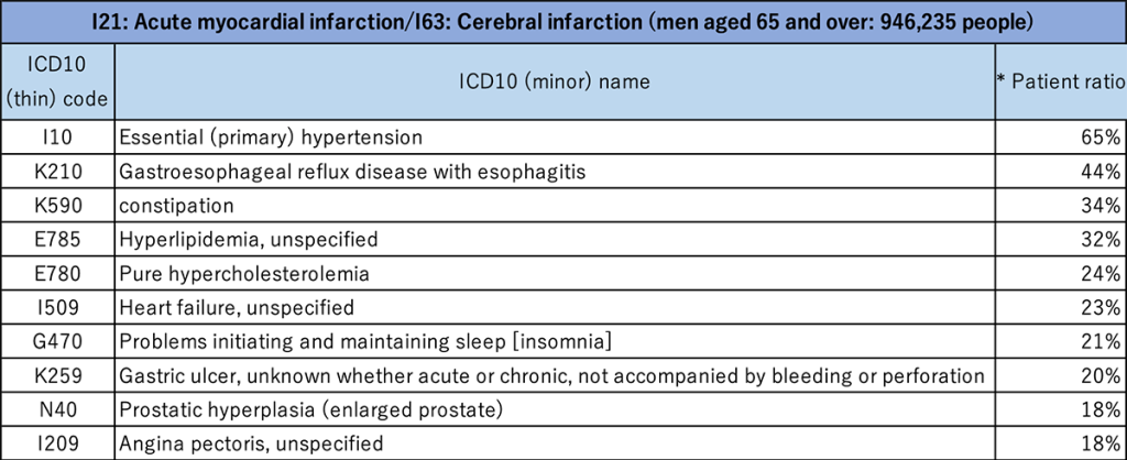In the overall ranking of comorbid diseases, trends differed by age, with acute infections (upper respiratory tract infections, gastroenteritis, etc.) prevalent among those under 65, and chronic diseases such as high blood pressure, constipation, gastroesophageal reflux disease, and dyslipidemia prevalent among those over 65. Meanwhile , in the ranking of comorbid diseases among patients with cerebral infarction and acute myocardial infarction, high blood pressure accounted for an overwhelming proportion, and cardiovascular diseases such as heart failure, hyperlipidemia, and angina pectoris tended to rank high .