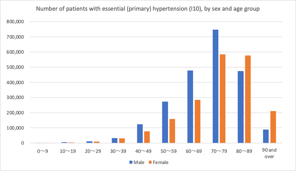 The number of patients diagnosed with hypertension increases with age, with a notable rise observed from the 60s through the 70s. A gender-based analysis shows that men outnumber women in younger and middle-aged groups. However, this gap narrows in the 80s, and women outnumber men in the 90+ age group. This trend likely reflects the longer life expectancy of women and their higher population proportion among the elderly.