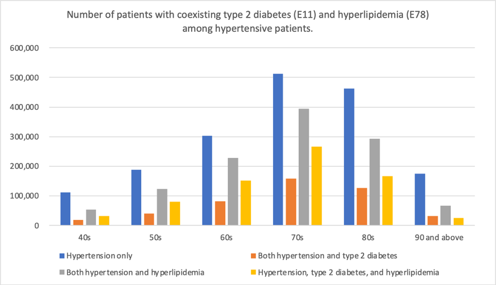 We then analyzed the number of hypertensive patients with comorbid type 2 diabetes and/or hyperlipidemia by age group (40s through 90+). Across all age groups, patients with hypertension only constituted the largest group. The next most common comorbidity was hyperlipidemia, especially among individuals in their 60s to 80s, indicating a strong overlap between hypertension and lipid disorders. Notably, the number of patients with all three conditions—hypertension, type 2 diabetes, and hyperlipidemia—peaked in the 70s.