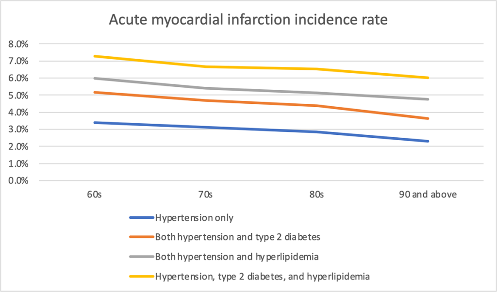 Among hypertensive patients aged 60 and above with comorbid type 2 diabetes and hyperlipidemia, the highest rates of myocardial infarction were observed in those with all three conditions. In their 60s, over 7% experienced myocardial infarctions, and rates remained above 6% even among those aged 90 and older. By contrast, the incidence decreased gradually with age in patients with hypertension only, dropping below 2.5% in those over 90.