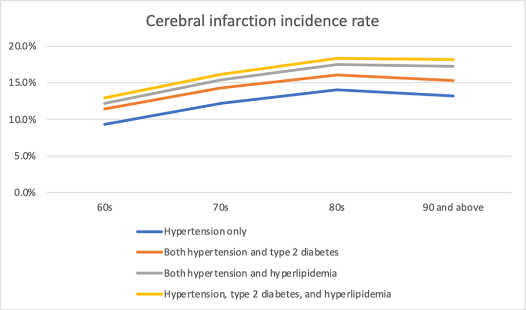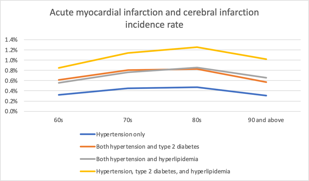 The risk of experiencing either myocardial or cerebral infarction increases with age and peaks in patients in their 80s. Patients with comorbid hypertension, type 2 diabetes, and hyperlipidemia consistently demonstrated more than double the incidence rates compared to those with hypertension alone. These findings underscore the compounded risk posed by multiple lifestyle-related diseases and the critical need for integrated disease management.