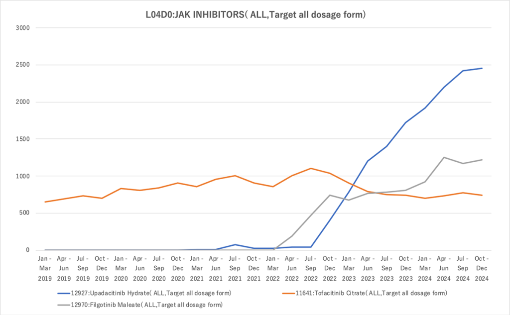 Eligible Facilities: 342 hospitals with complete data for the specified period Among JAK inhibitors, “upadacitinib hydrate” has seen a steady increase in prescriptions since its market introduction and has become the most frequently pre- scribed of the three agents since 2023. Additionally, “filgotinib maleate” has also shown a gradual increase in prescription numbers.