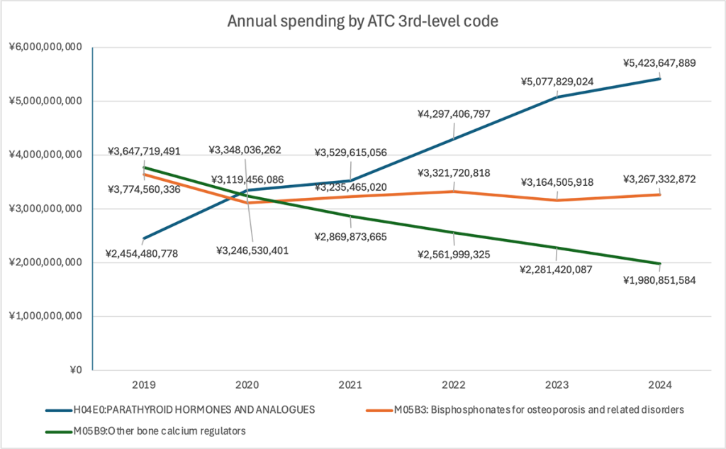 Spending on “Other Agents Affecting Bone and Calcium Metabolism” (blue line) more than doubled—from about ¥2.45 billion in 2019 to ¥5.42 billion in 2024—and has been the largest expenditure category since 2021.