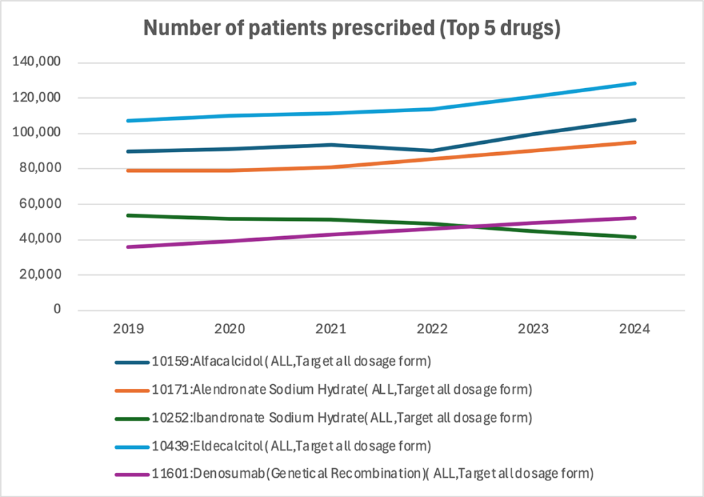 Denosumab (purple), an anti-RANKL monoclonal antibody, has grown steadily since 2019 and reached approximately 50,000 patients in 2024. This rise mirrors the increasing prominence of “Other Agents Affecting Bone and Calcium Metabolism” observed in the ATC-category analysis and suggests a strengthening market presence.