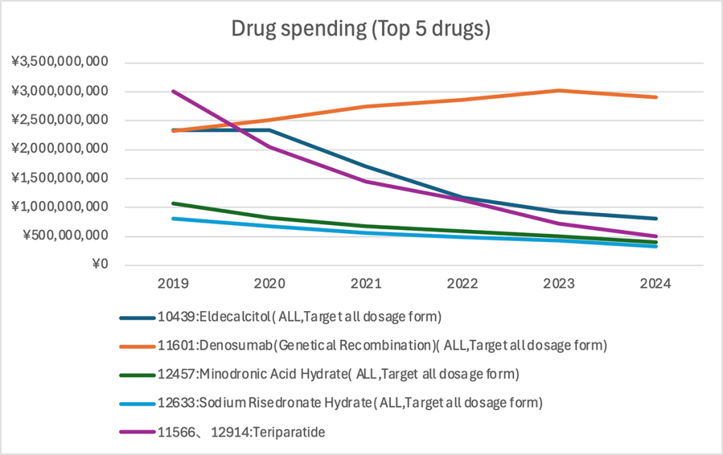 Denosumab (orange line) has been the highest-spend drug since 2020, surpassing ¥3 billion in 2023 before dipping slightly to around ¥2.9 billion in 2024.